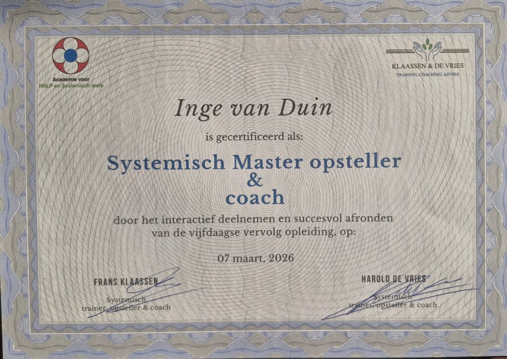 Na 5 intensieve en prachtige dagen ben ik geslaagd voor mijn master systeem opstellen, waardoor ik nog meer verdieping kan bieden in de begeleiding van mensen en teams.
